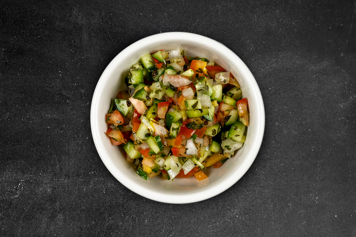 Finely chopped tomatoes, cucumber and onion with mint and vinegar dressing.