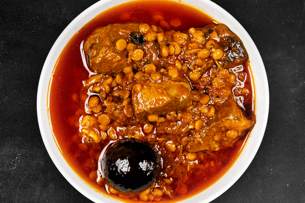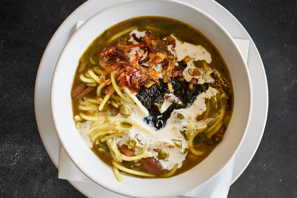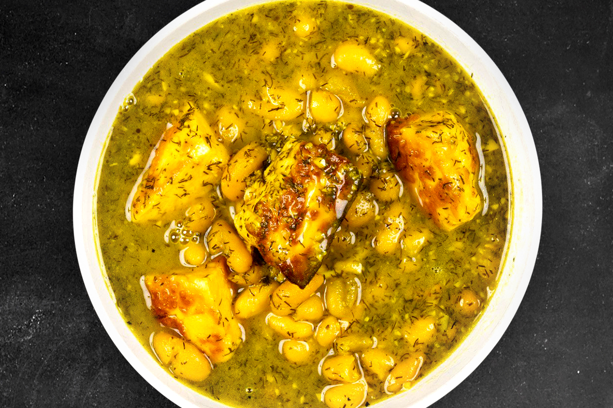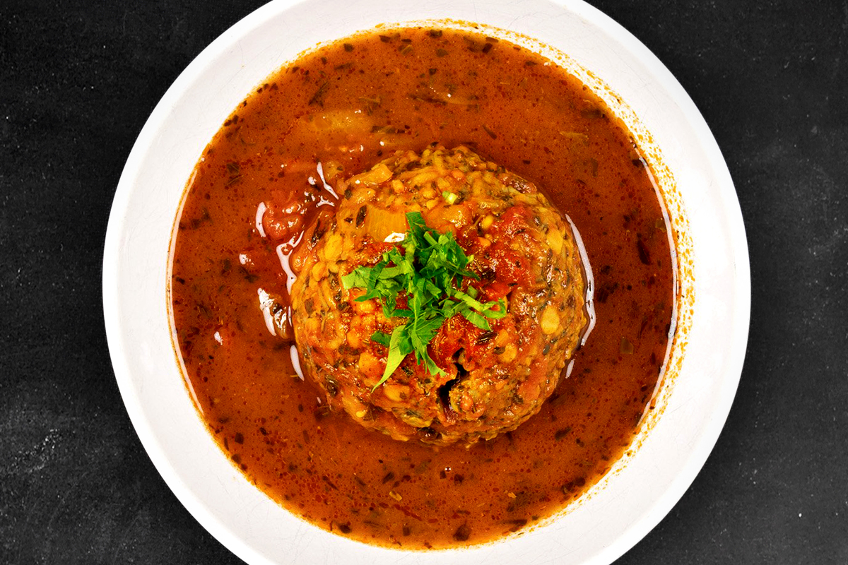 Slow cooked fresh herbs, lentils, beans, chickpeas, onion, Persian noodles then garnished with fermented yoghurt, fried dried mint and caramelised onion.