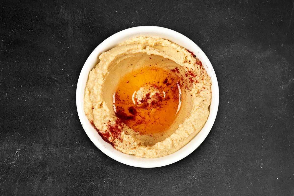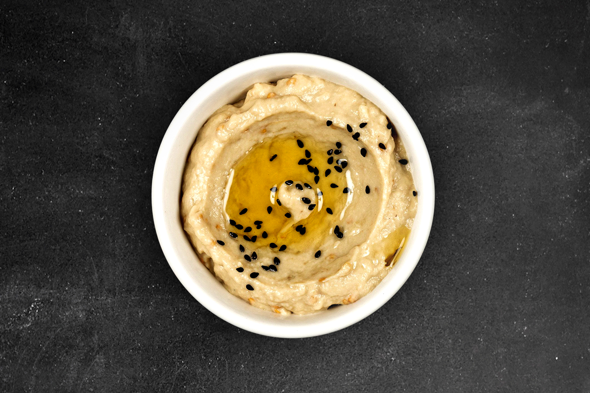Cooked, mashed chickpeas with tahini, lemon juice finished with spicy vegetable oil