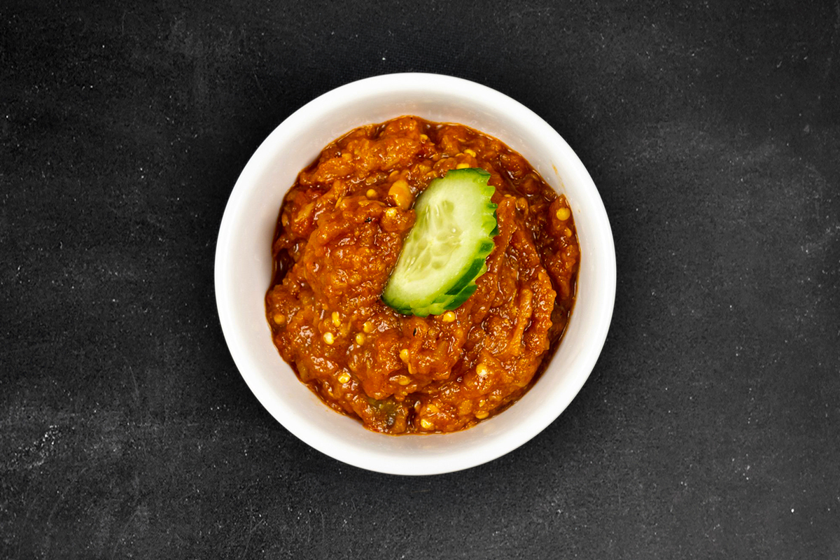 Charred eggplant crushed with tomato then slow cooked with garlic.