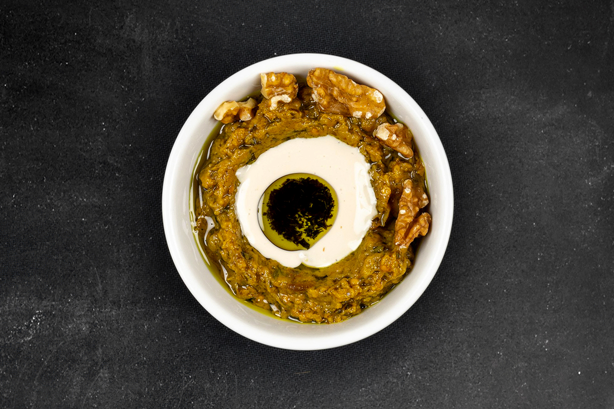 Mashed cooked eggplant with tahini and garlic finished with parsley and olive oil.