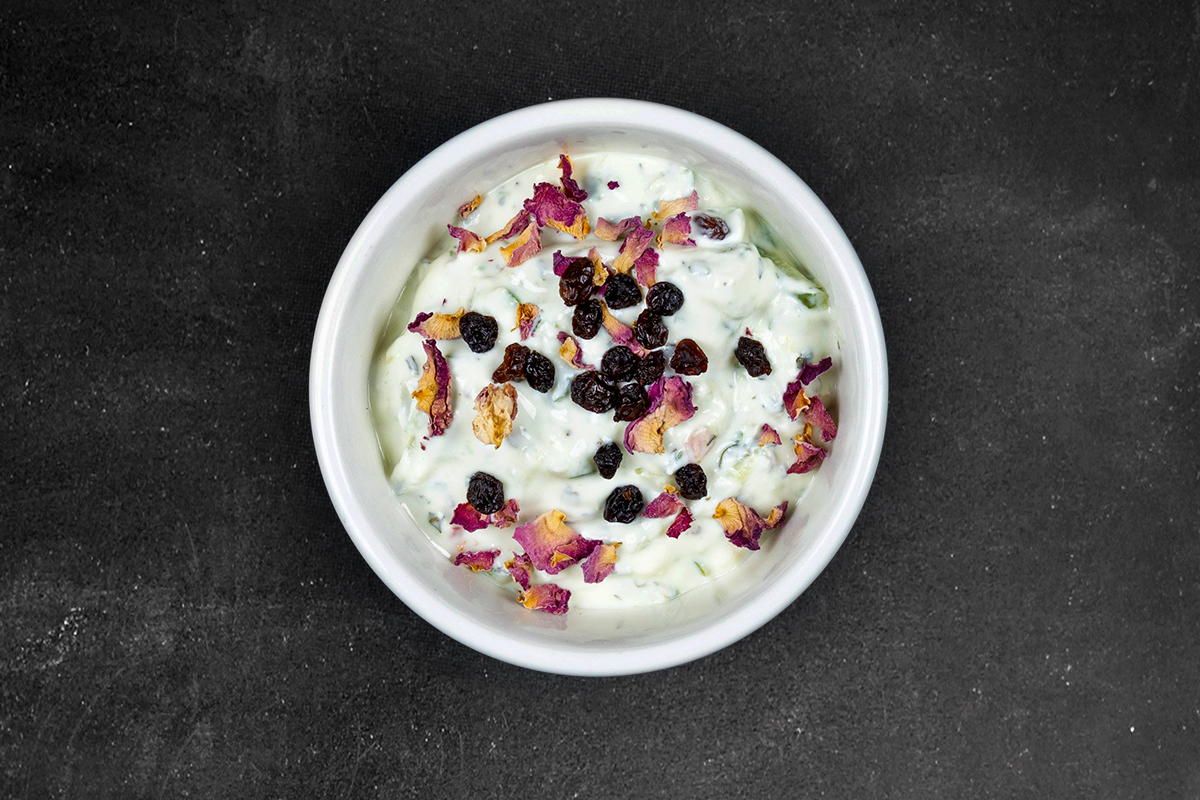 Creamy yoghurt, cucumber, dried mint, walnuts garnished with rose petals and black currant.