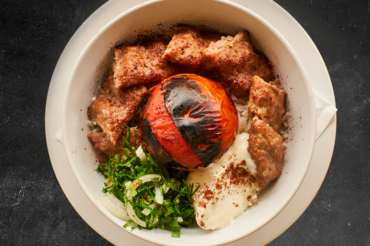 Minced lamb with grilled tomato, chopped parsley onion and yoghurt on a bowl of rice.