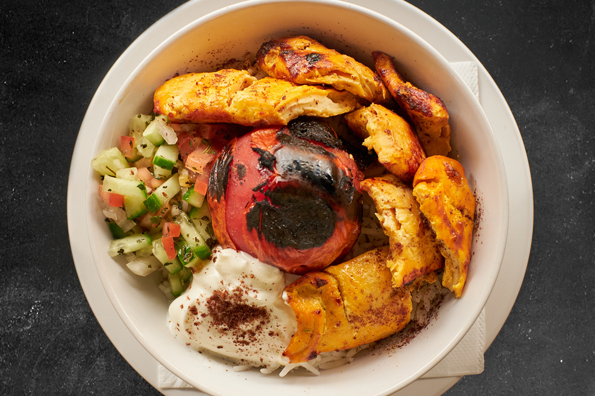 Marinated saffron chicken with grilled tomato, Shirazi salad and yoghurt on a bowl of rice.