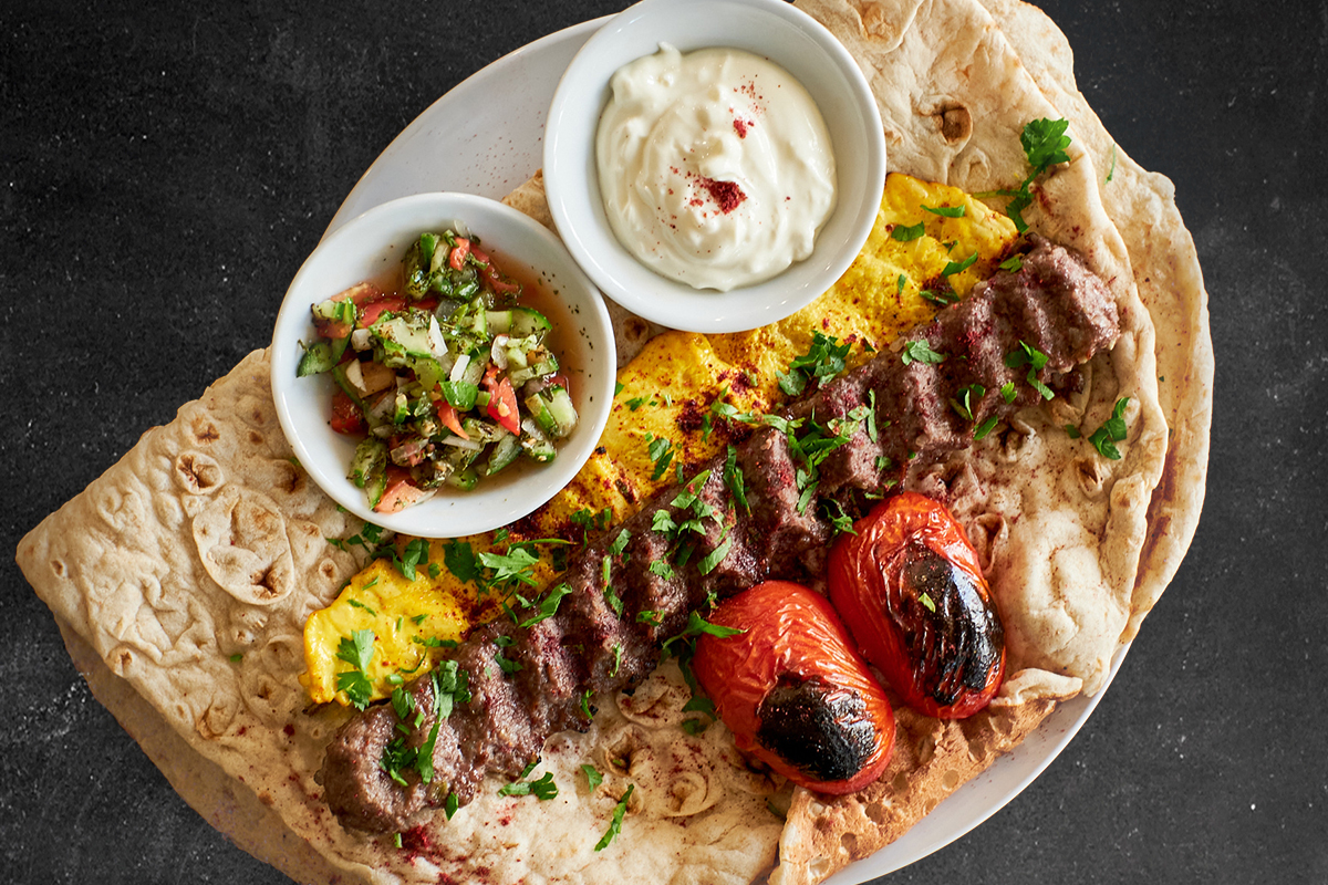 Grilled saffron chicken and minced lamb served on lavash bread with grilled tomato, Moosir dip and shirazi salad