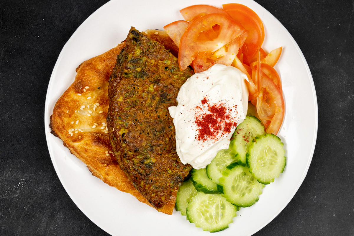 Parsley, coriander, dill, garlic chives, walnuts and barberries baked into a fluffy frittata served with shallot dip, fresh chopped cucumber and tomatoes on Afghan bread.