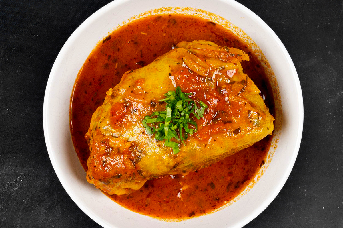 Gluten Free. Chopped herbs, split peas, soybeans and rice all wrapped in cabbage then slow cooked in a tomato sauce.