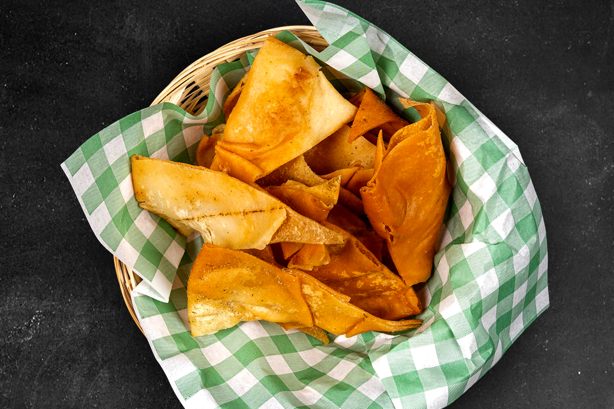 A bag of deep fried pita bread garnished with oregano.